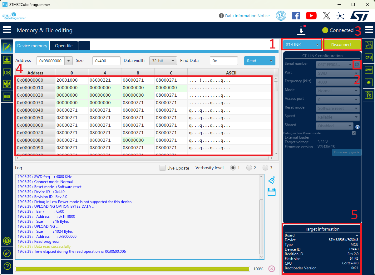 После этого переходи в ST Cube Programmer, выбираем справа вверху ST-Link, жмем на значок <mark style="color:$primary;">"Обновить"</mark> и должен появиться серийный номер. Это означает, что программа видит подключенный программатор и теперь нажимаем <mark style="color:$primary;">"Connect"</mark>, программатор вычитает память и определит тип микроконтроллера справа внизу: