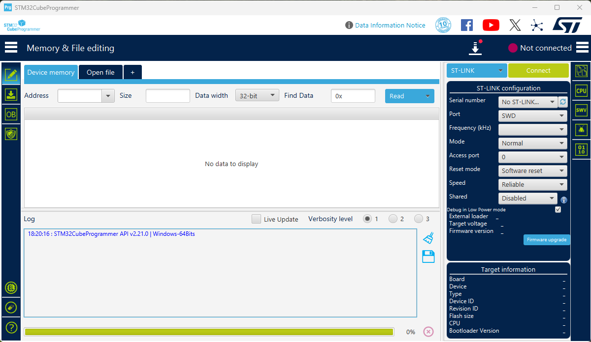 Во время установки вам предложит установить драйвера для ST-Link, обязательно соглашаемся, иначе ST Cube Programmer не увидит программатор среди списка устройств. После установки открываем программу, вам будет доступно окно: